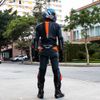 Feito de couro perfurado, este traje oferece tanto fluxo de ar quanto proteção.